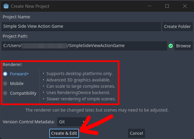 스크린샷처럼 'Forward+'로 냅둬도 어지간한 컴퓨터에서는 잘 작동한다. 하지만 간혹 오래된 컴퓨터는 이를 지원하지 않는 경우가 있어서 'Forward+'로 설정하면 프로젝트를 열 수 없는 경우가 있다. 만약 프로젝트가 열리지 않는다면 해당 프로젝트는 삭제하고 [렌더러]를 'Compatibility'로 설정한 새로운 프로젝트를 만들자.