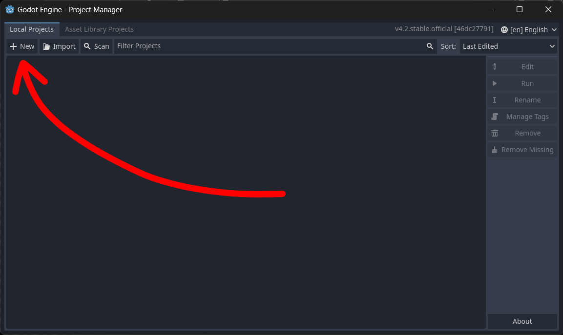 처음 프로젝트 매니저를 켰으면 우선 할 일은 [언어 설정]이다. 위 스크린샷에서 빨간 화살표가 가리키는 부분인데 '[en] English', 즉 영어로 지정 되어있으면 [언어 설정]은 건드리지 않아도 된다.