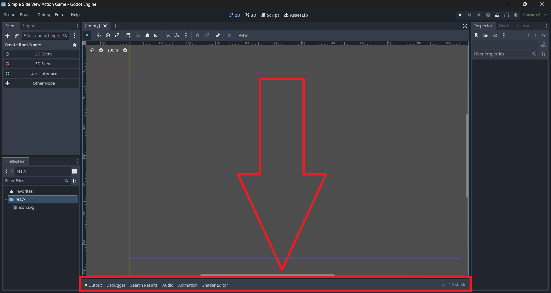 마지막으로 설명할 영역은 [바텀 패널]이다. 콘솔 출력(Output)이나 애니메이션 에디터 등 여러가지 잡다한 도구들이 자리잡는 공간이다.