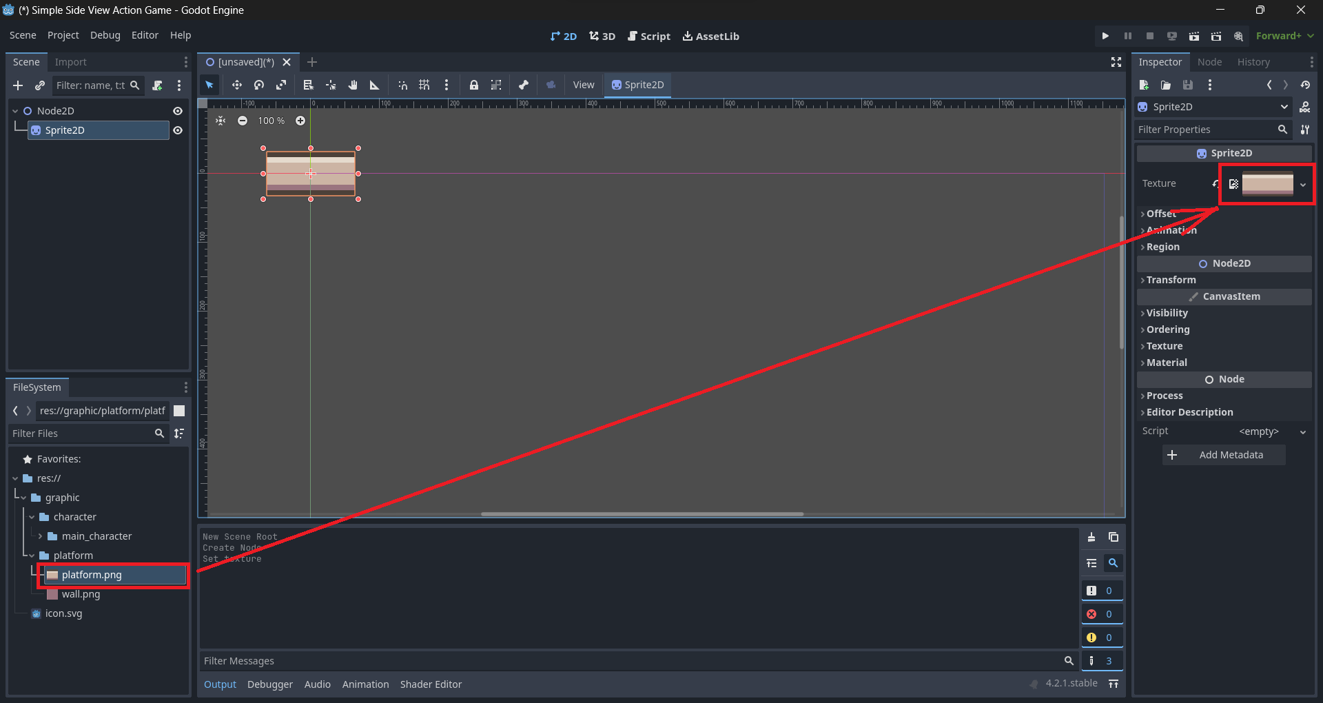 파일 시스템에서 platform폴더에 들어있는 platform.png파일을 이 texture속성에 드래그하면 2D 스크린에 platform.png의 그래픽이 표시된다. [Sprite2D]는 이렇게 자신의 texture속성에 할당된 그래픽을 2D 스크린에 표시해주는 역할을 가진 [노드]인 것이다.