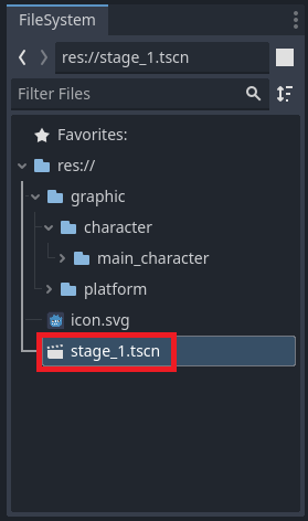 이제 지금까지 만든 것들을 저장하자. Ctrl+S를 입력하면 저장할 수 있다. ‘stage_1.tscn’이라는 이름으로 저장하자.