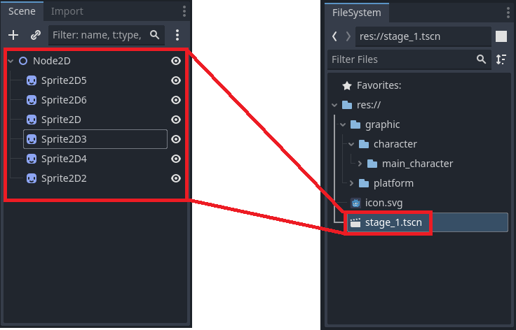 팁2) 씬 독에서 더 위에 위치하는 노드일수록 2D 스크린에 먼저 그려지기 때문에 더 아래에 있는 노드에 가려진다. 그러니 앞으로 나와야 하는 노드는 씬 독에서 더 아래에 위치시키자.