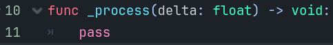 _ready메서드 바로 다음 부분도 마찬가지로 이번에는 _process라는 비어 있는 메서드가 정의되어 있다.