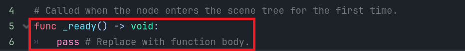 func은 [메서드](‘함수’라고도 부른다.)를 만들 때 작성하는 키워드이다. [메서드]는 이 스크립트의 어떤 동작을 명시한 것이다. 위 스크린샷에서는 _ready라는 이름의 [메서드]를 정의하고 있는데, 그 내용은 아직 작성되지 않았다. 고도에서 내용이 없는 [메서드]는 내용이 있어야 할 자리에 pass키워드를 넣어야 오류가 나지 않는다.
