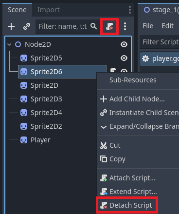 실수로 다른 노드에 스크립트를 부착했다면, 해당 노드를 선택하고 씬 독 오른쪽 위에 있는 스크립트 떼기 버튼을 클릭하거나 노드를 우클릭하면 나타나는 메뉴에서 Detach Script를 선택하면 노드로부터 스크립트를 제거할 수 있다.