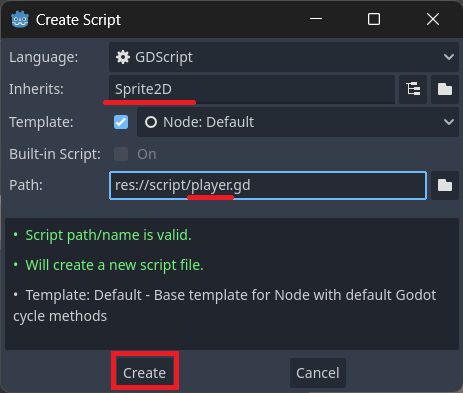 Inherits가 Sprite2D로 지정된 것을 확인하고, [스크립트] 파일의 이름을 player.gd로 지정한 다음 Create버튼을 클릭하자.
