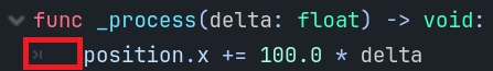 _process메서드의 내용 중 pass를 지우고 그 자리에 스크린샷과 같이 코드를 작성하자. 이때 position 앞의 빈 공간은 [Tab]키를 눌러서 입력해야 한다. 이를 [들여쓰기]라고 하는데, 고도엔진에서는 어떤 코드가 어느 부분에 포함되어 있는 지를 이 [들여쓰기]를 통하여 구분한다. 스크린샷의 상황을 예로 들자면, func 키워드로 메서드를 선언한 다음 줄부터 [들여쓰기]를 하면 그 내용은 해당 메서드에 포함되는 내용이라는 것이다.