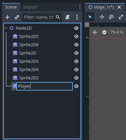 지난 시간에 만들었던 stage_1씬을 열고 Sprite2D노드를 하나 생성하자. 노드를 선택한 상태에서 F2키를 누르거나, 노드를 우클릭하면 나타나는 메뉴에서 Rename버튼을 클릭하면 노드에 이름을 지어줄 수 있다. 플레이어가 조작할 캐릭터이니 ‘Player’라는 이름을 지어주자.