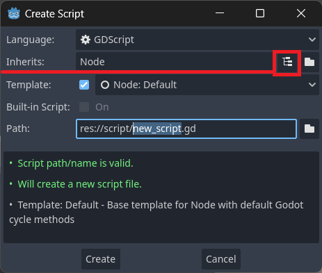 새로운 스크립트를 생성하는 창이 나타나는데, Inherits라는 부분에 주목하자. Inherits는 한국어로 ‘상속한다’는 의미이다. 우리가 생성할 [스크립트]가 무엇을 기반으로 동작할 지를 지정하는 부분인데, 우리가 지금 만들 [스크립트]는 Player노드에 부착할 것이고, Player노드는 Sprite2D이므로 이 스크립트는 Sprite2D를 상속해야 한다. Inherits칸 바로 오른쪽의 버튼을 클릭하자.
