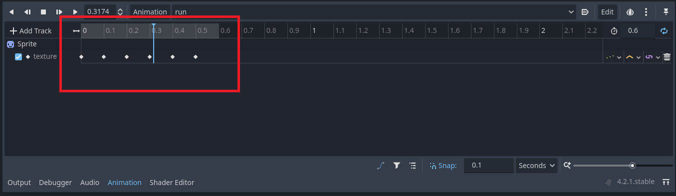 재생해봤더니 0.2초 간격은 좀 느린 것 같다. 애니메이션의 총 길이를 0.6초로 줄이고 키프레임간의 간격이 0.1초가 되도록 다시 배치해보자.