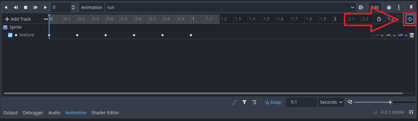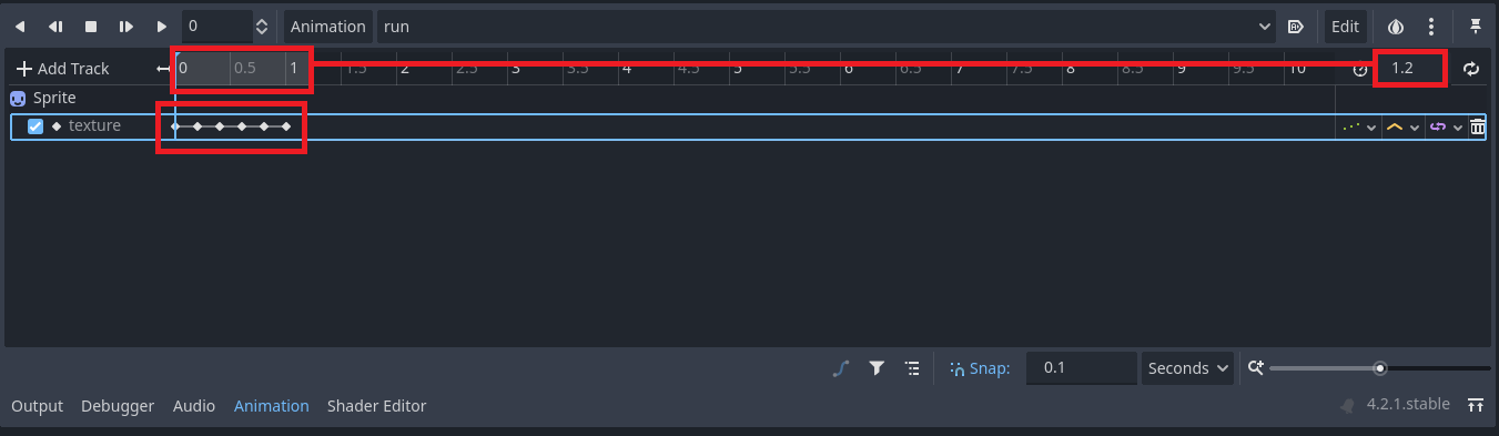 이번에는 키프레임을 6개 준비하고, 루프 버튼 바로 왼쪽에 1.2를 입력하여 run애니메이션의 길이를 1.2초로 설정하자.