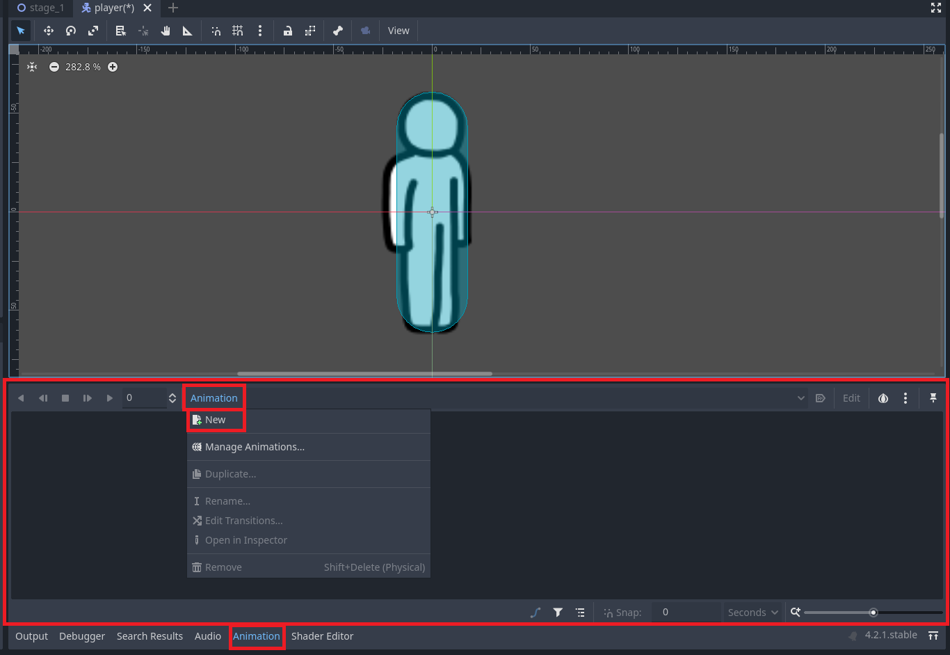 이제 player씬에서 애니메이션을 적용해보자. AnimationPlayer를 선택하자.