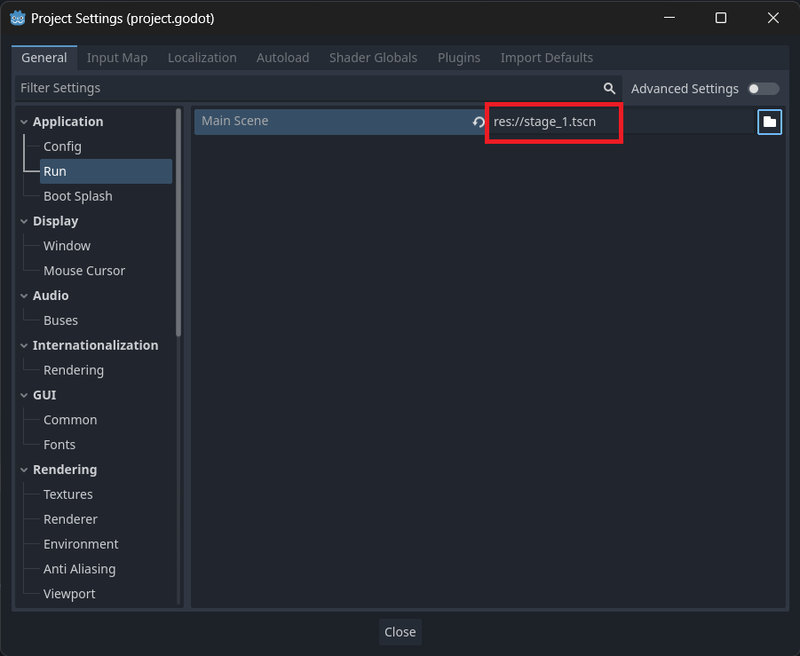 에디터 왼쪽 위 메뉴를 통하여 프로젝트 설정창을 열고 Application - Run 설정에서 Main Scene을 지정해주자.