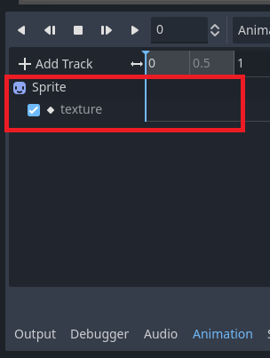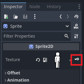 애니메이션 탭이 켜져있는 상태에서, Sprite노드를 선택하고 인스펙터를 보면 속성들 바로 오른쪽에 열쇠모양 버튼이 나타난다. texture속성에 붙어있는 열쇠모양 버튼을 클릭하자.