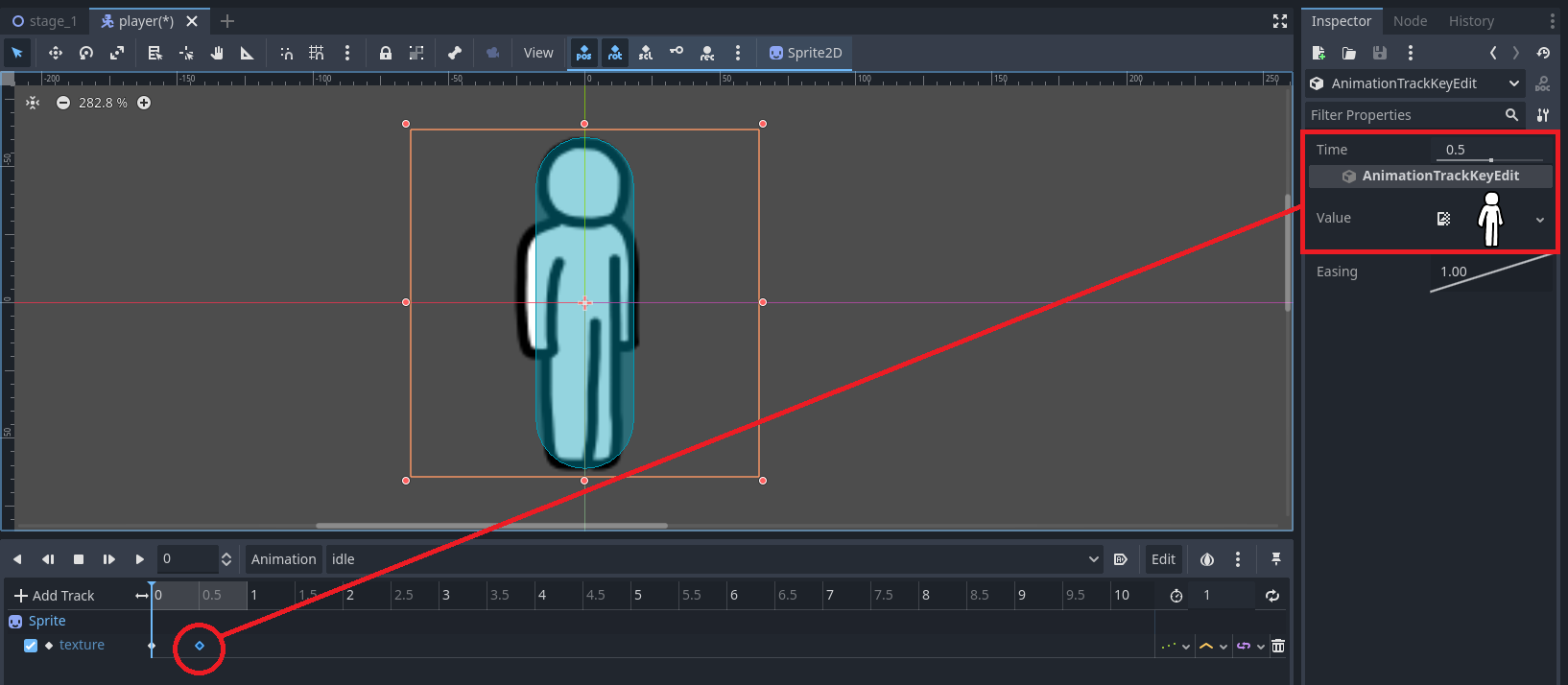 그리고 파일 시스템으로부터 idle_001.png파일을 0.5초 지점의 키프레임의 값에 드래그하자.