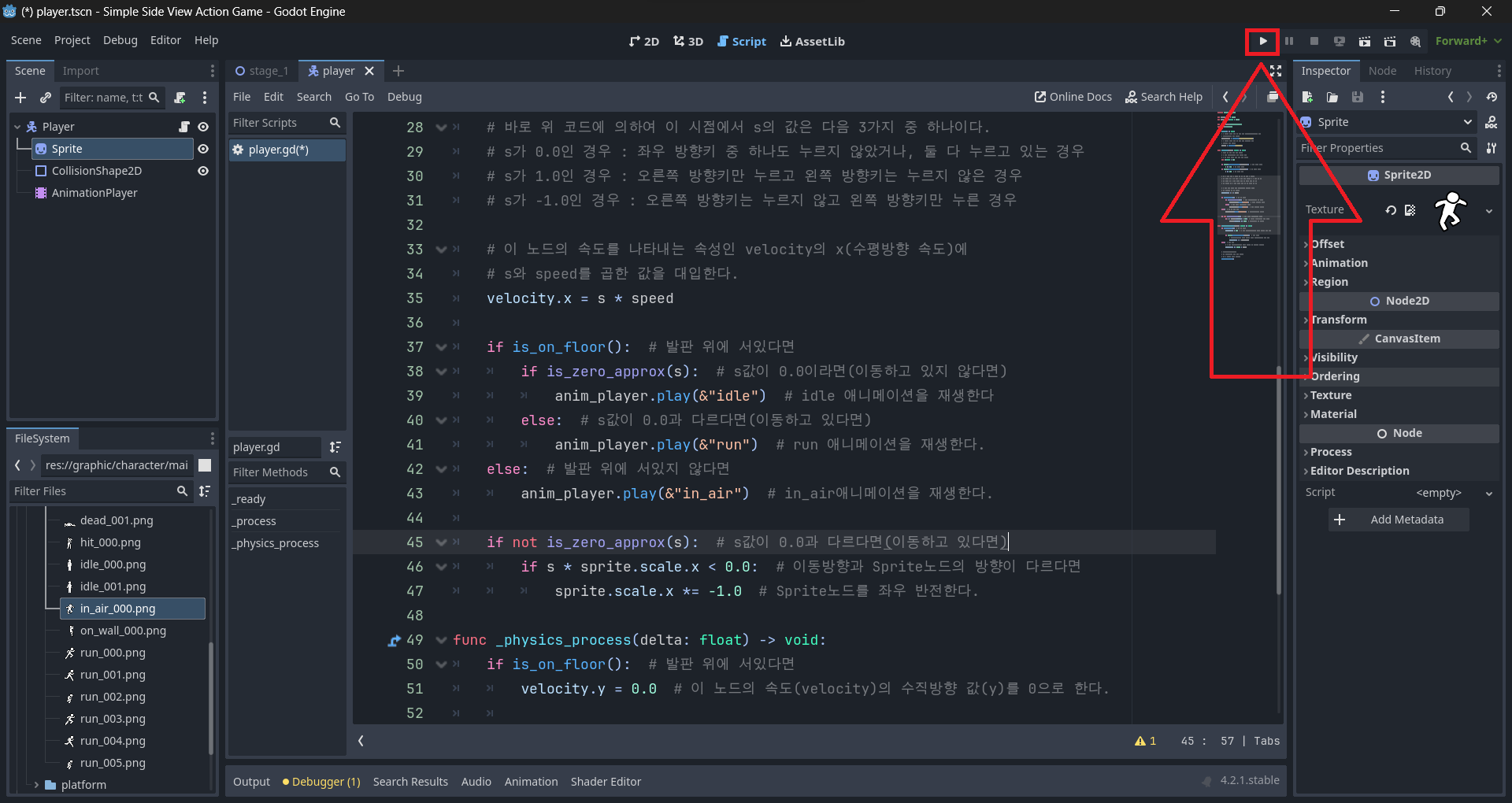 실행하고 캐릭터를 조작해보면 기본, 이동, 체공 애니메이션이 적용된 모습을 볼 수 있다.