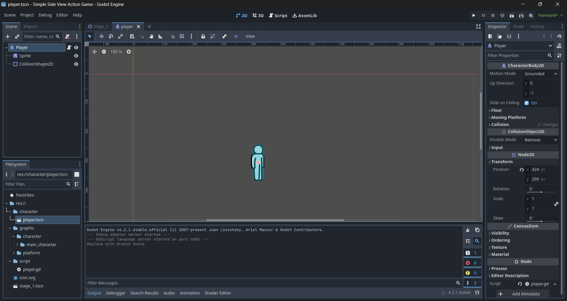 그리고 stage_1 씬에서 Player노드를 character폴더에 드래그한다.