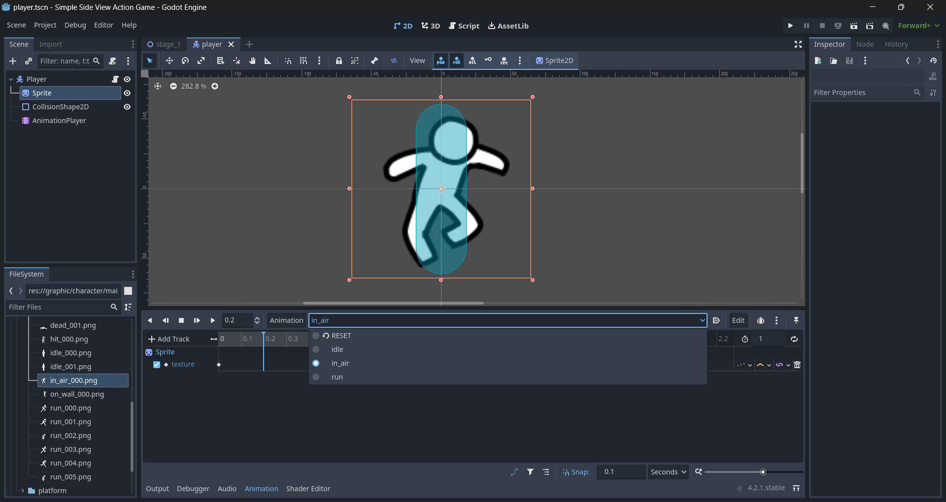 in_air라는 이름의 애니메이션을 생성하고 마찬가지로 Sprite의 texture속성에 대한 트랙을 생성해준 뒤 키프레임에 in_air_000.png파일을 값으로 지정해주자.