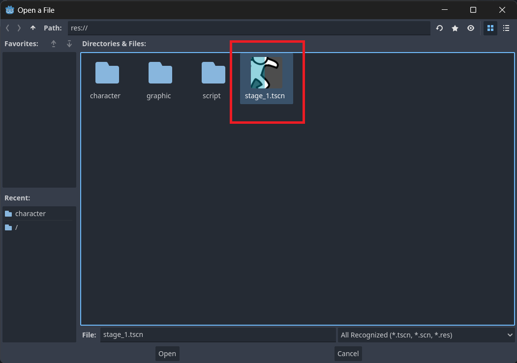 stage_1씬을 열 때와 마찬가지로 파일 시스템에서 player씬을 더블클릭하여 열어보자.
