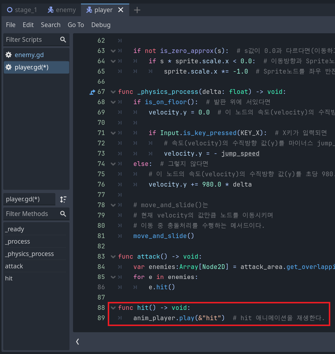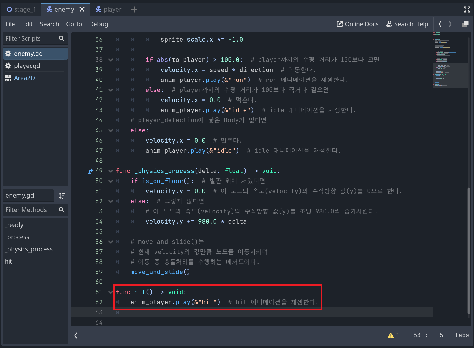 이제 enemy.gd 스크립트를 연 다음 스크린샷과 같이 새로운 hit함수를 추가해주고