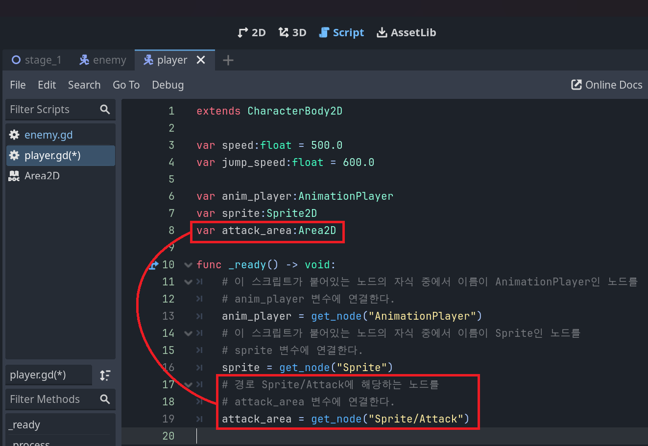 player.gd스크립트를 열고 스크린샷의 강조된 부분들을 추가해준다.