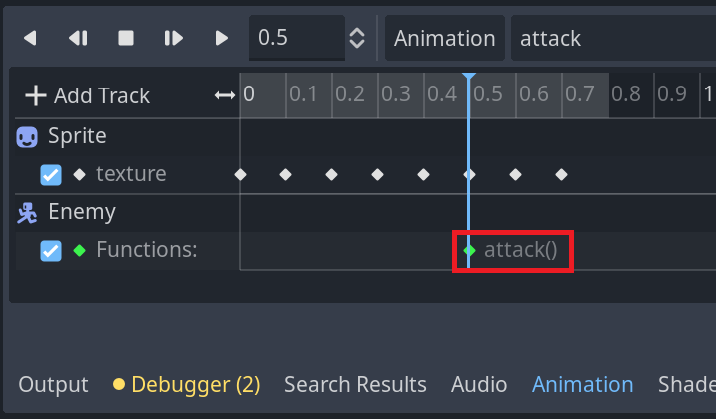 주인공 캐릭터의 공격을 구현할 때와 마찬가지로, enemy씬에서 attack애니메이션에 Call Method Track을 추가하고 attack함수에 대한 키프레임을 추가해준다.