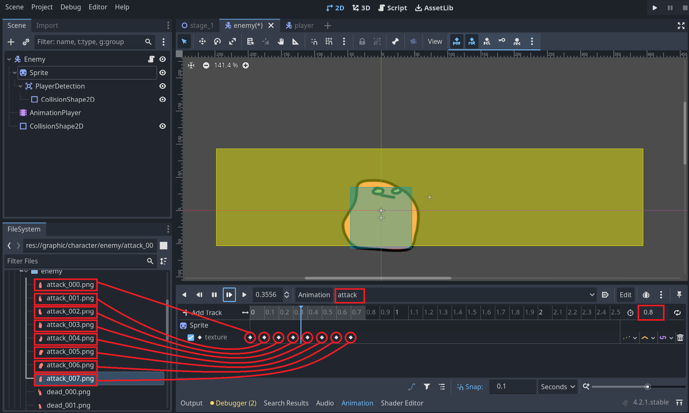 공격 애니메이션의 이미지로부터 공격 판정의 위치를 가늠하기 위하여 attack애니메이션의 2번째 키프레임에 재생 헤드를 맞춰놓자. 그리고 Sprite노드의 하위에 Area2D노드를 생성하고 또 그 하위에 CollisionShape2D노드를 추가해준다.