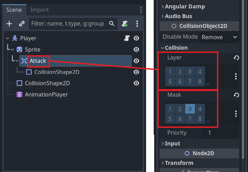 Attack노드의 인스펙터에서 Layer와 Mask를 설정한다.