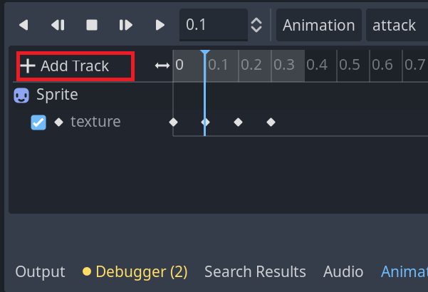 이제 attack애니메이션의 특정 재생 시점에서 방금 작성한 attack함수가 작동하도록 해야 한다. 이를 위하여 [Add Track]버튼을 클릭하고