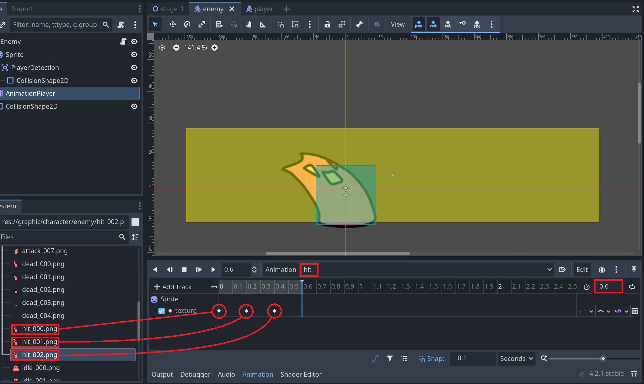 5. graphic/character/enemy폴더의 hit_000.png ~ hit_002.png 이미지들을 각 키프레임에 지정해준다.