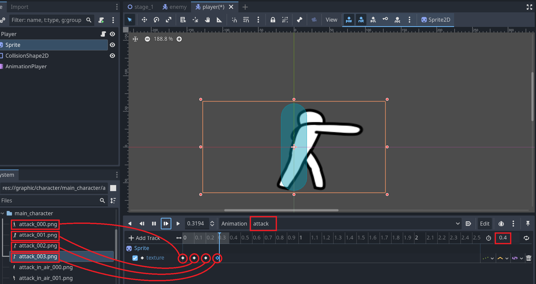 5. graphic/character/main_character폴더의 attack_000.png ~ attack_003.png 이미지들을 각 키프레임에 지정해준다.
