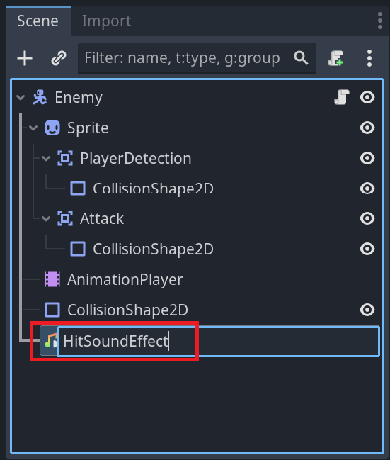 2. 생성한 AudioStreamPlayer노드의 이름을 HitSoundEffect로 바꿔준다.