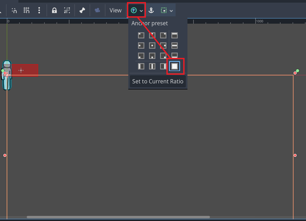 UI노드를 선택하고 Anchor preset을 꽉 찬 사각형 모양으로 설정하여 게임 표시 영역을 꽉 채우게 만들어주자.