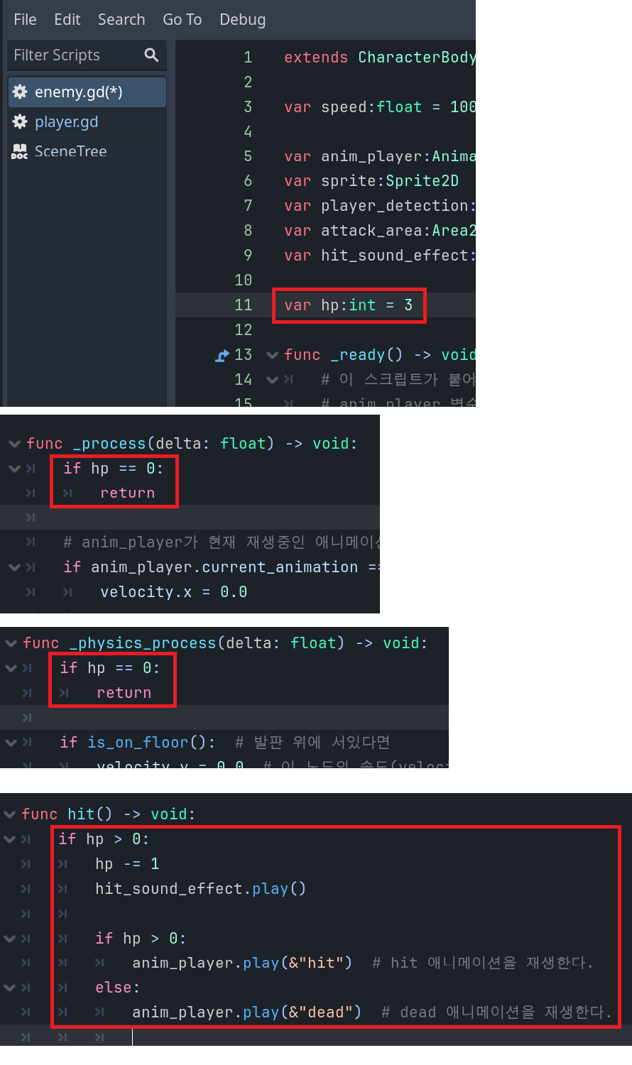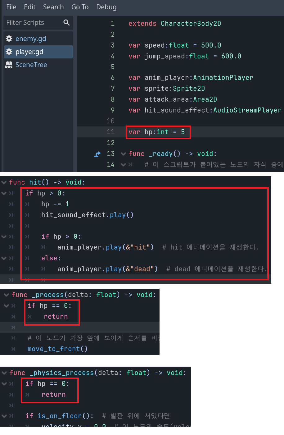 dead애니메이션을 완성했으면 스크린샷과 같이 player.gd스크립트에 코드를 추가 작성하여 실제 hp를 구현해보자.