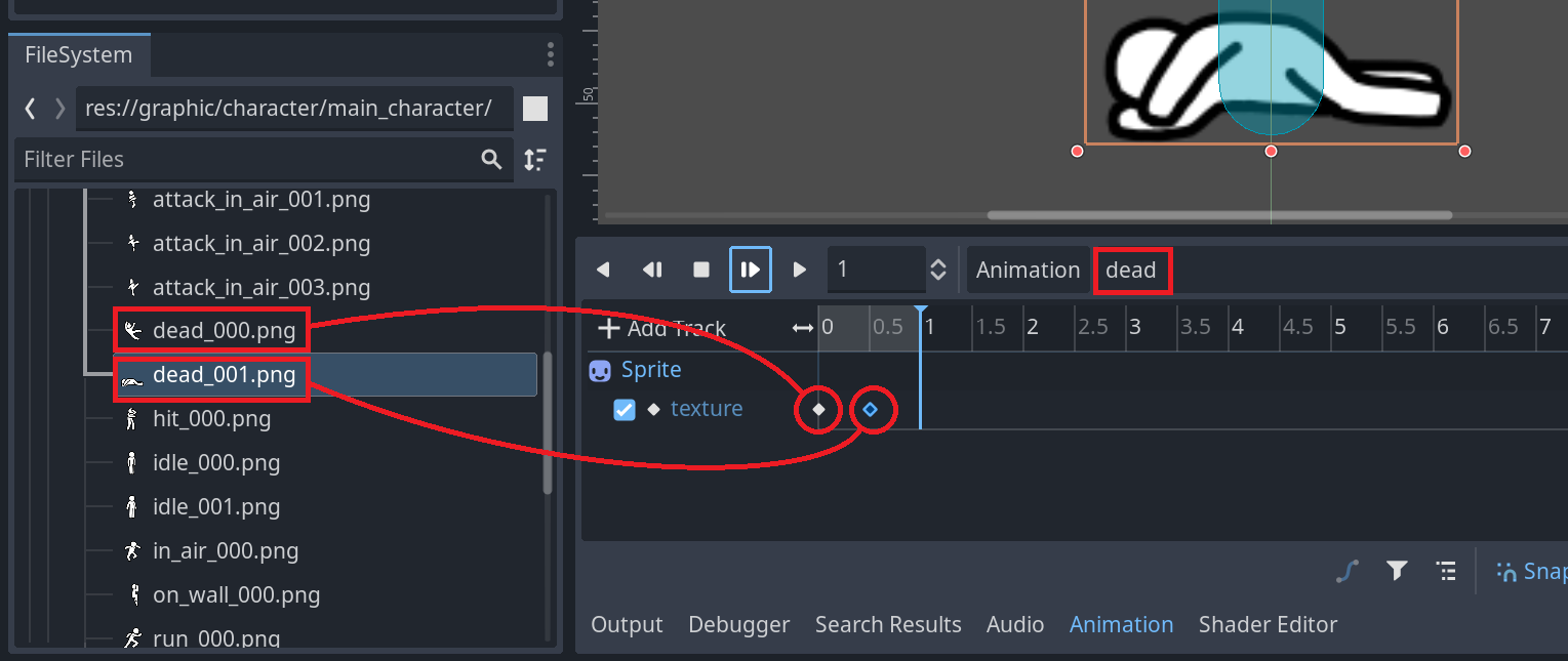 4. graphic/character/main_character폴더의 dead_000.png와 dead_001.png 이미지를 각 키프레임에 할당한다.