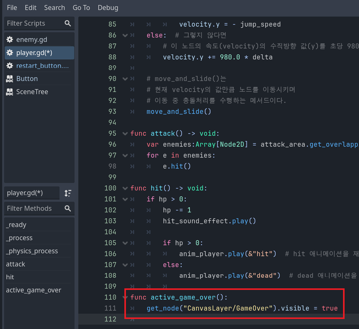 이제 player.gd 스크립트를 열고 active_game_over함수와 그 내용을 추가해주자.
