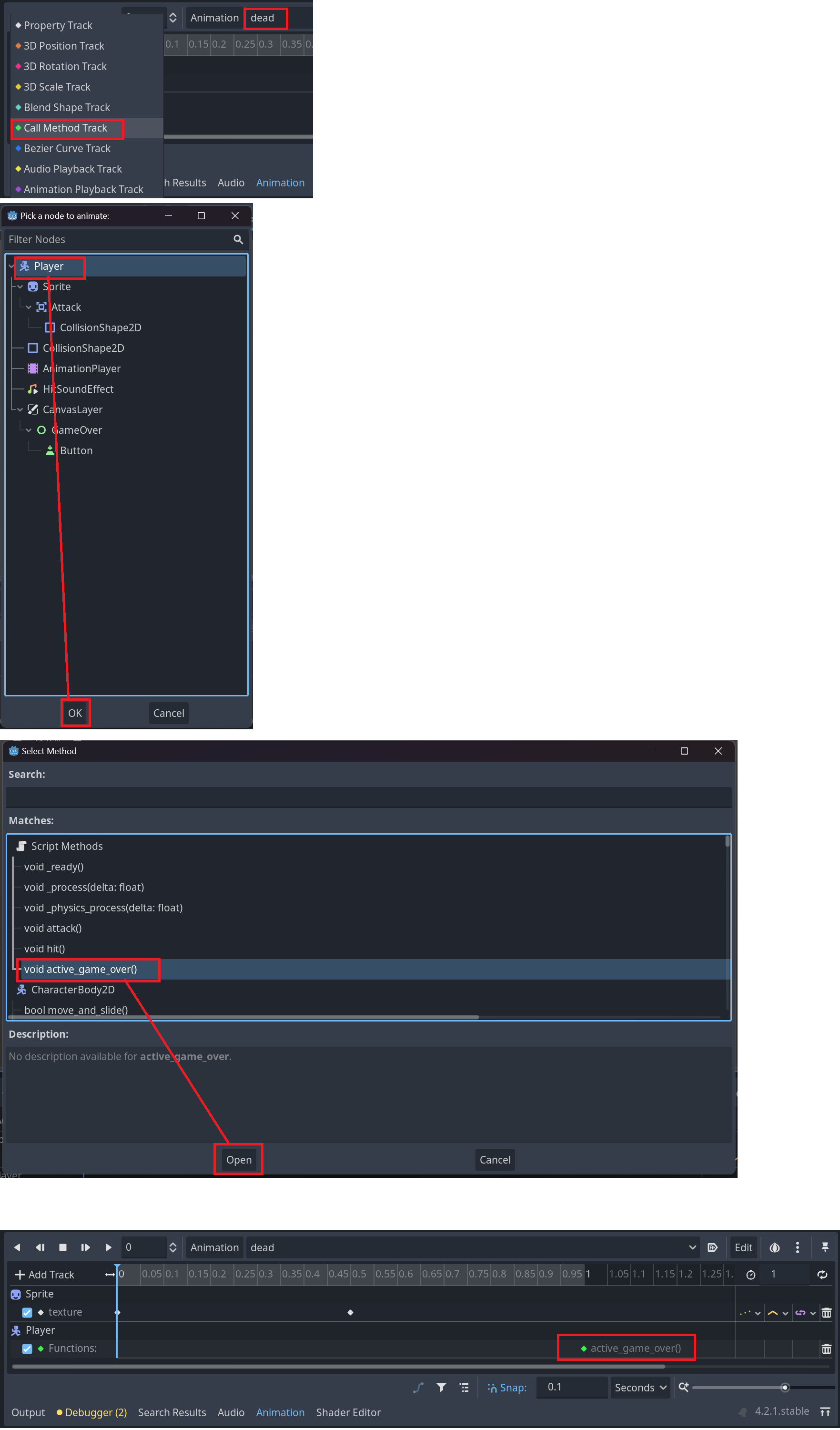 마지막으로 dead애니메이션의 끝부분에서 방금 코딩한 active_game_over함수가 작동하도록 Call Method Track을 추가하고 키프레임에 해당 함수를 할당해주면 재시작 버튼 구현 완료다.
