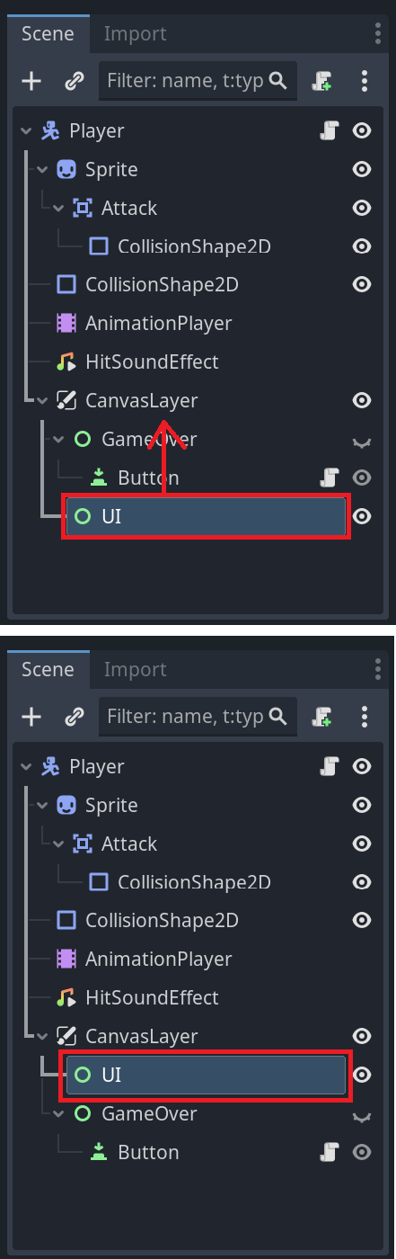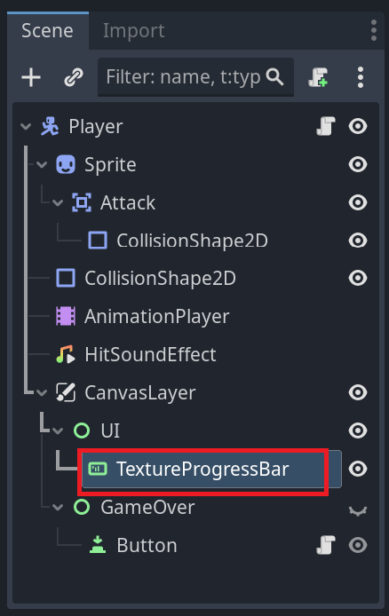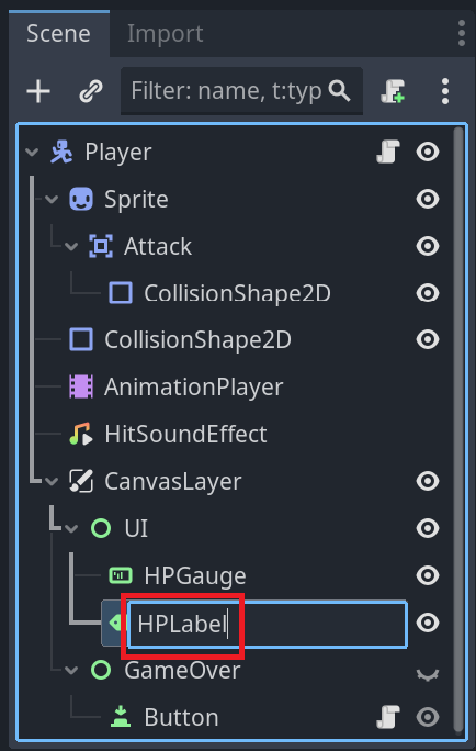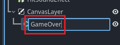 그리고 재시작 UI는 주인공 캐릭터가 사망하기 전에 보이면 안 되니 씬 독에서 GameOver노드 오른쪽의 눈 모양 버튼을 클릭하여 숨겨주자. (또는 인스펙터에서 visible속성을 꺼도 된다. 둘은 완전히 같은 동작에 해당한다)