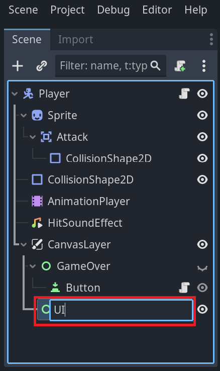 player씬의 CanvavsLayer노드 하위에 Control노드를 하나 더 생성해주고 이름을 UI로 수정해준다.