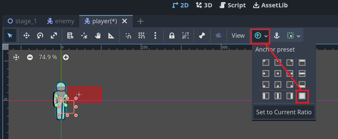 GameOver노드를 선택한 상태에서 2D스크린 바로 위의 툴 바를 보면 스크린샷과 같이 연두색 동그라미 안에 십자가 들어간 버튼을 찾을 수 있는데 클릭하자. 그리고 뜨는 Anchor preset메뉴에서 가장 오른쪽 아래의 꽉 찬 사각형 모양 버튼을 클릭하자.