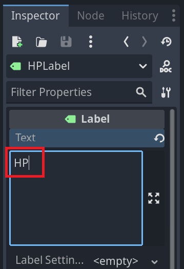 HP게이지가 HP게이지임을 더 확실히 플레이어에게 전달하기 위하여 Label노드를 UI노드 하위에 추가해주자. Label노드는 Control노드의 일종인데 화면에 텍스트를 표시해주는 역할을 한다.