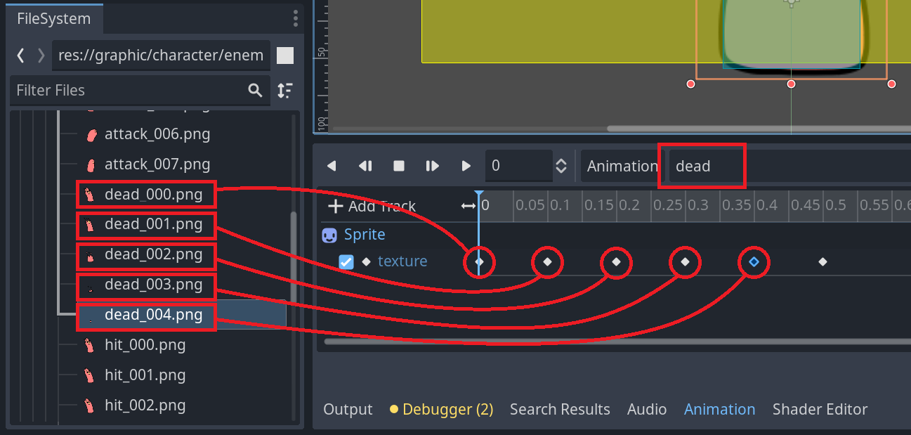4. graphic/character/enemy폴더의 dead_000.png ~ dead_004.png의 5개의 이미지를 첫 키프레임부터 차례대로 할당해준다.