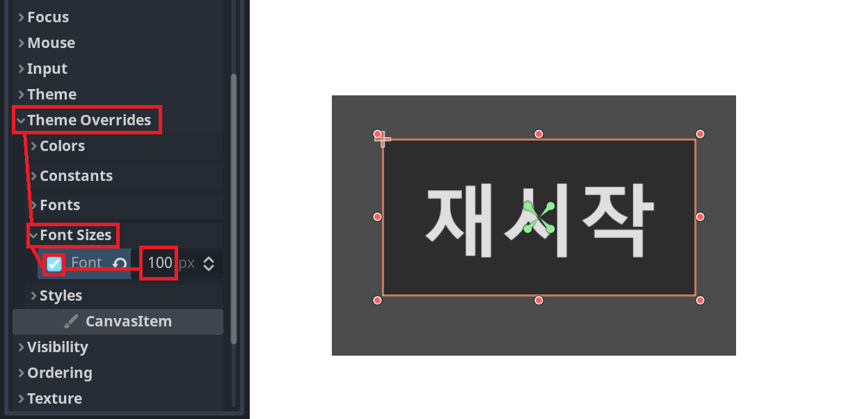 [Theme Overrides]-[Font Sizes]-[Font] 속성의 체크박스를 활성화하고 그 값을 100으로 설정하여 버튼에 ‘재시작’이라는 커다란 글자를 나타내자.