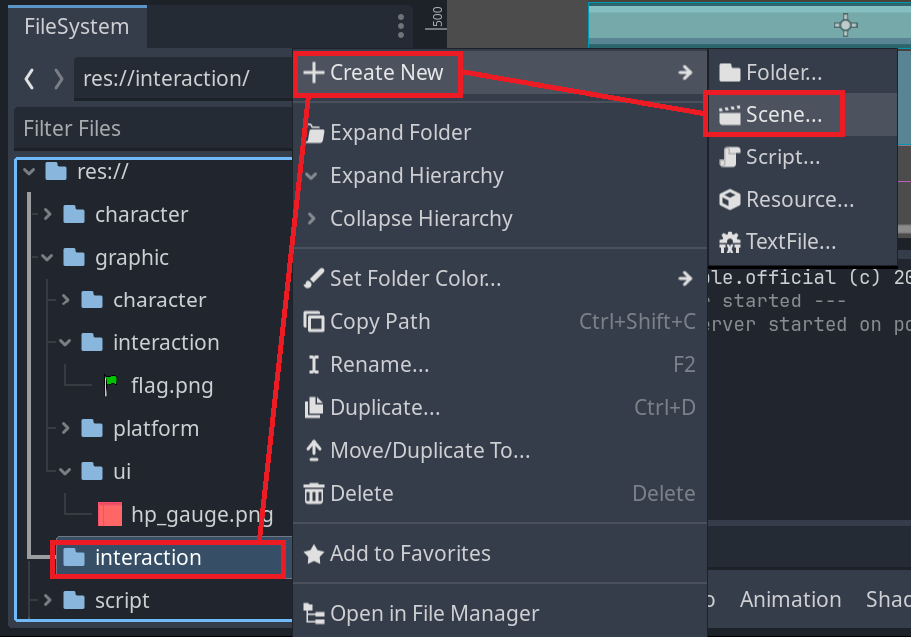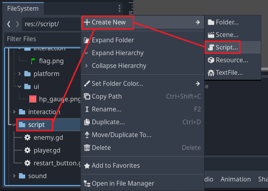 깃발 씬의 노드 구성은 다 끝났다. 이제 깃발을 실제 동작하게 할 스크립트를 작성하자. script폴더를 우클릭하고 [Create New]-[Script]를 선택하여 새 스크립트 파일을 생성하자.