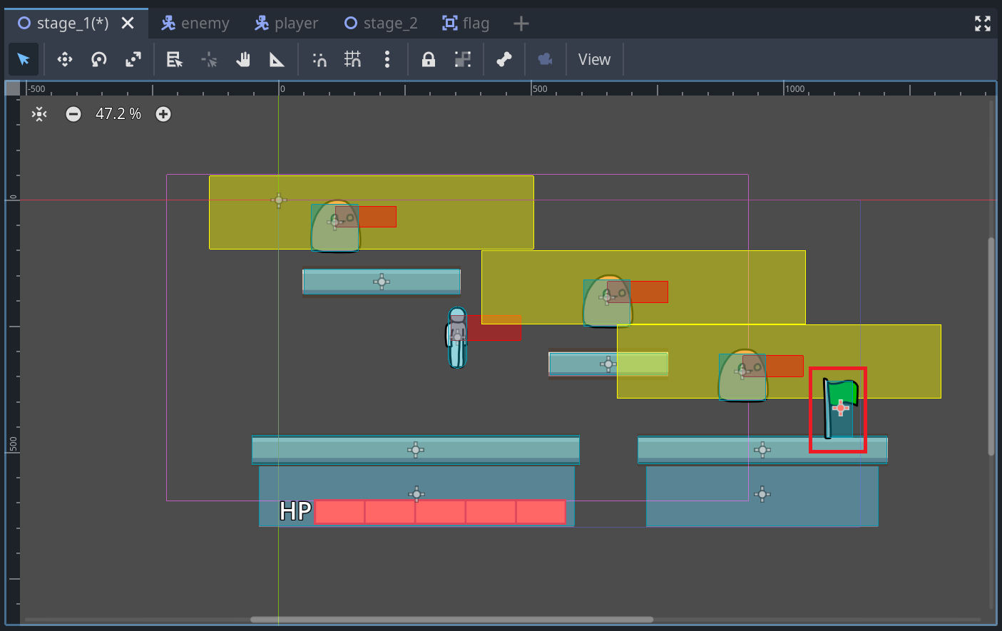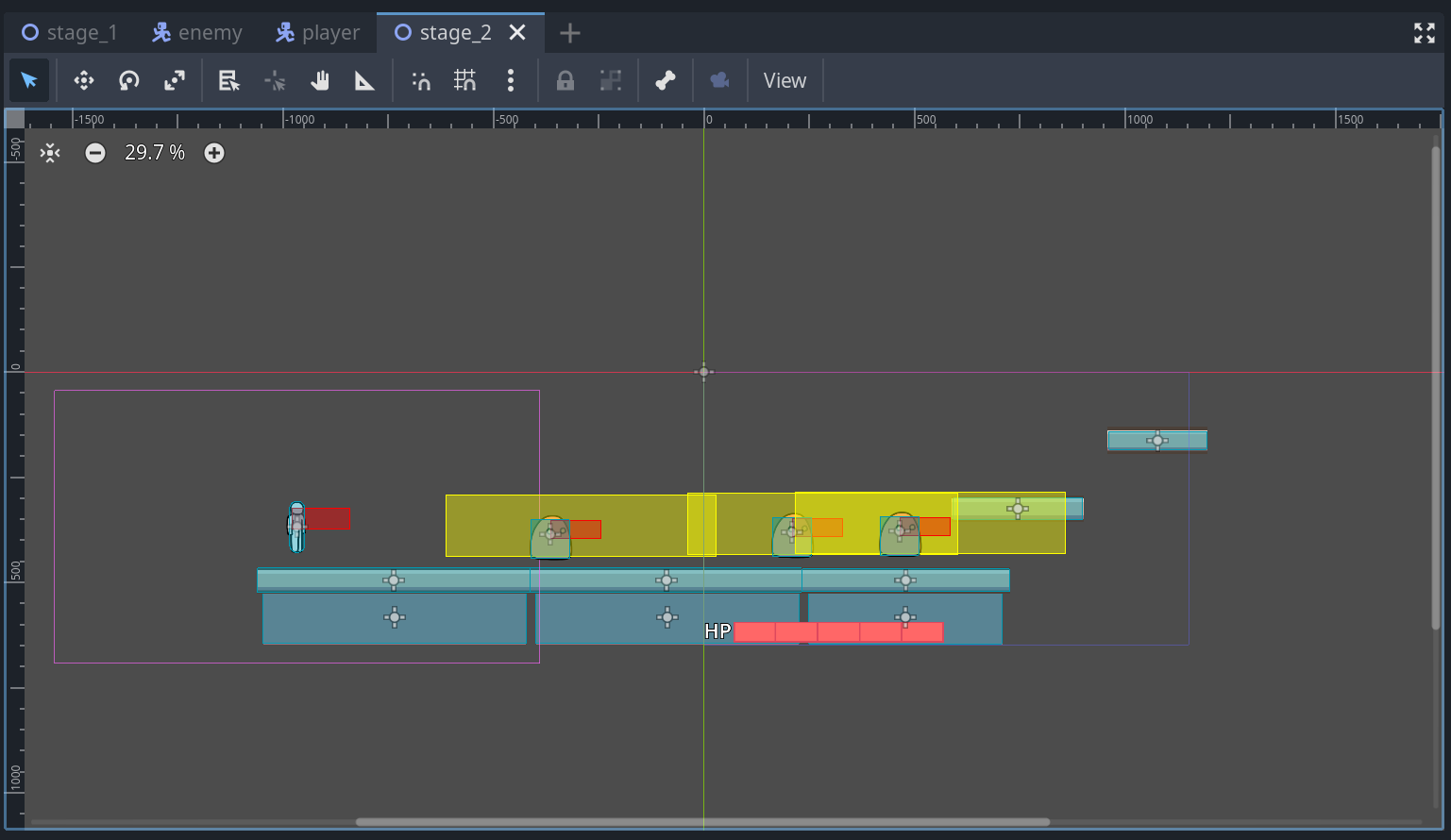노드들을 적당히 옮기고 배치해서 stage_1과 구분되는 구조를 만들어주고 Ctrl+S로 stage_2씬을 저장해주자. 원한다면 새로운 땅과 더 많은 적 캐릭터를 추가해도 좋다.