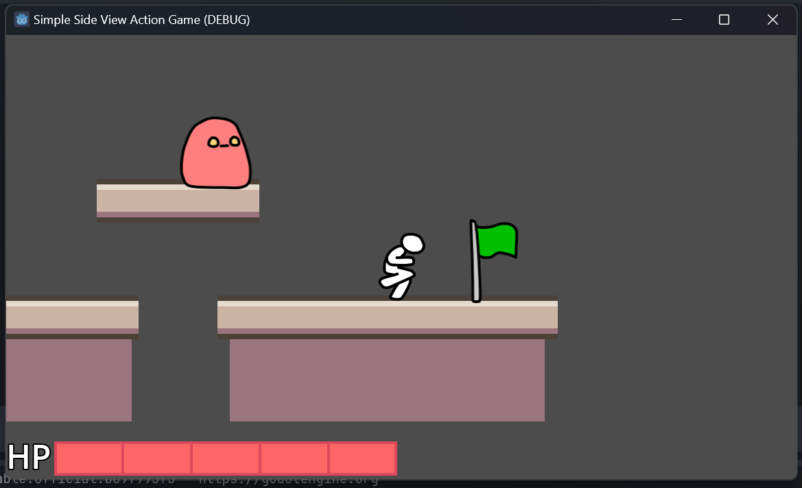 잘 작동하는지 확인하기 위하여 F5키를 눌러서 메인 씬(stage_1)을 실행하고 주인공 캐릭터를 깃발에 부딪히게 해보자.