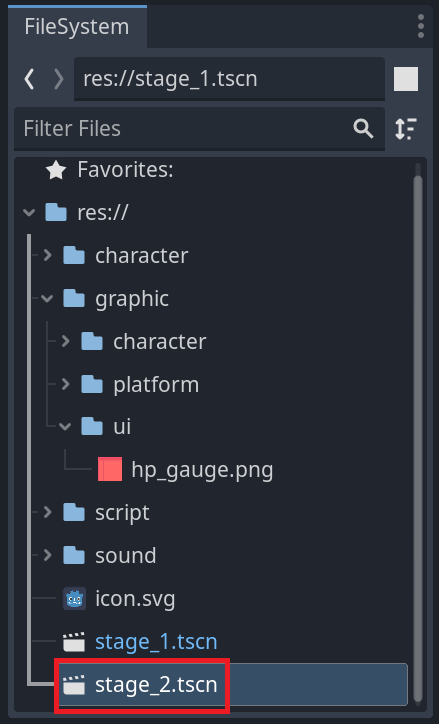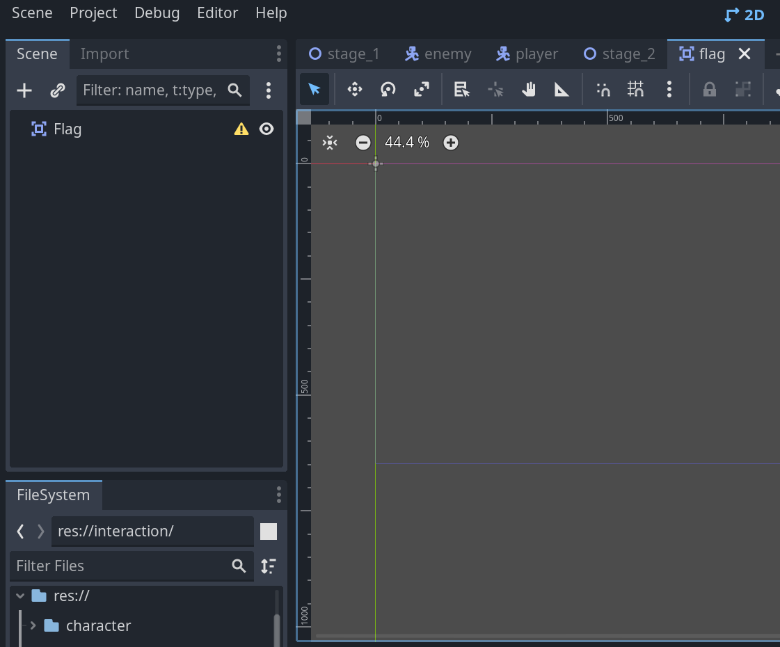 이제 stage_1씬에 배치한 Flag씬을 선택하고 인스펙터에서 next_scene_path 속성에 방금 복사한 stage_2씬의 경로를 붙여넣기하자. (알거라고 생각하지만… 붙여넣기는 Ctrl+V를 누르면 된다) 이로서 스테이지 간의 이동을 구현 완료하였다.
