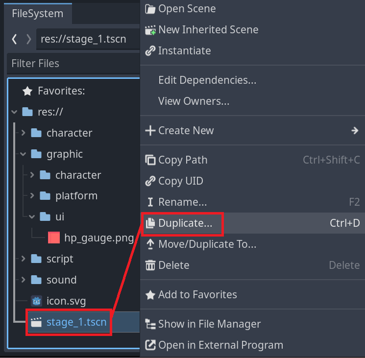 파일 시스템 독에서 stage_1씬을 우클릭하고 Duplicate메뉴를 선택한다. (또는 단축키 Ctrl+D)