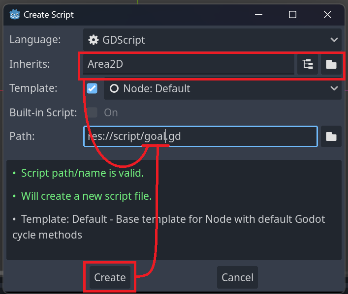 이 스크립트는 깃발 씬의 최상위 노드(Area2D)에 붙일 것이니 상속할 스크립트를 Area2D로 지정해주자. 그리고 스크립트의 이름은 goal이라고 짓자.