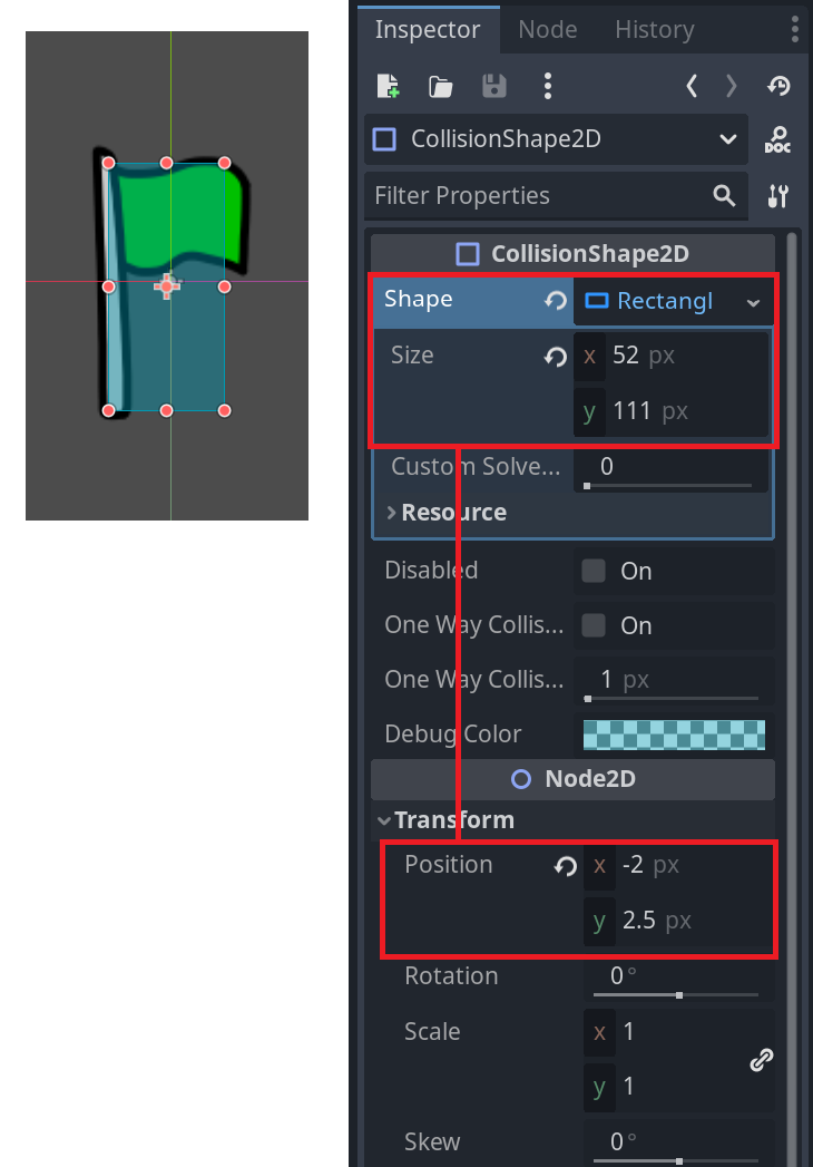 그리고 CollisionShape2D노드도 생성해준다. shape속성을 RectangleShape2D로 설정한 뒤 크기와 위치를 조절하여 Area2D인 최상위 노드의 충돌 범위를 설정해준다.